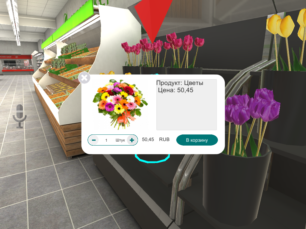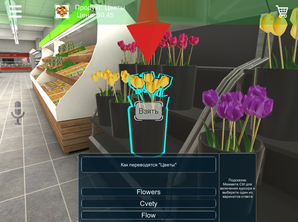 Запустив приложение, обучаемый оказывается внутри 3D модели гипермаркета, с возможностью передвигаться внутри с использованием стандартных игровых интерфейсов. На полках гипермаркета лежат продукты и товары, которые можно выбирать и класть в виртуальную корзину при условии выполнения ряда языковых упражнений (табл. 1).