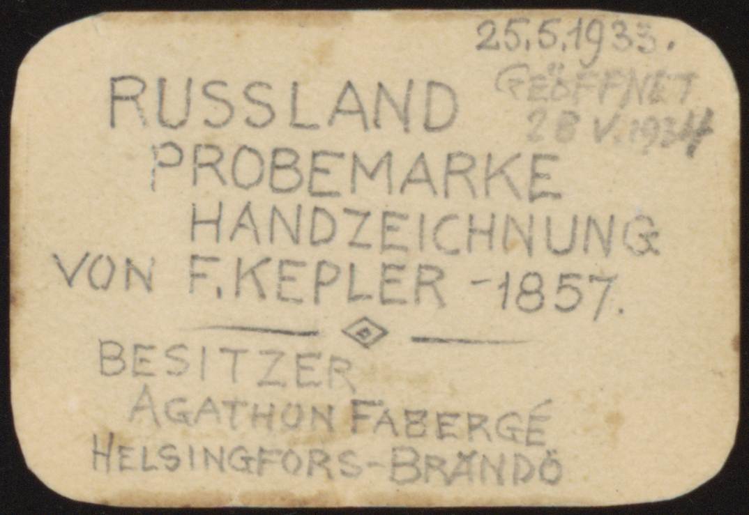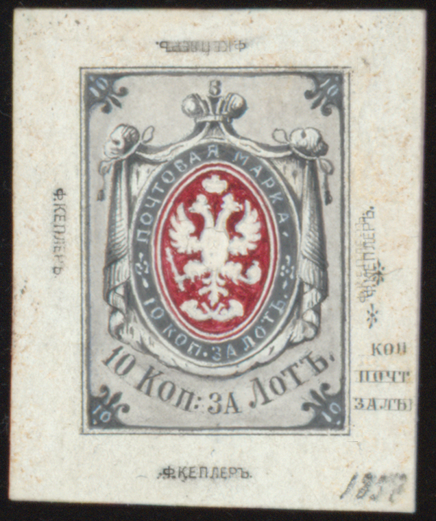 Рис. 3. Проект утверждённого рисунка первой русской Почтовой марки с этикеткой, написанной рукой А.К.Фаберже. 1857.