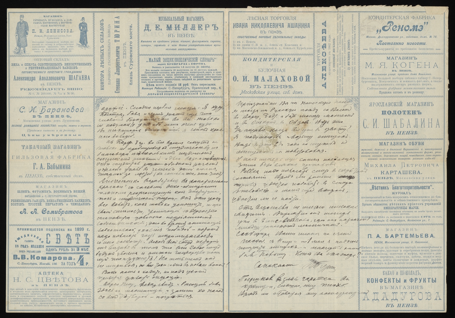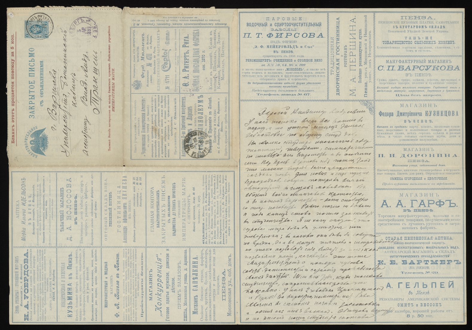 Рис. 5. Закрытое благотворительное письмо с объявлениями. РИ. 20.01.1899. Серия 44. Саратов (Пенза). 7 коп. Бумага, рукопись (синяя и красная), чернила (черные чернила). 298х425.