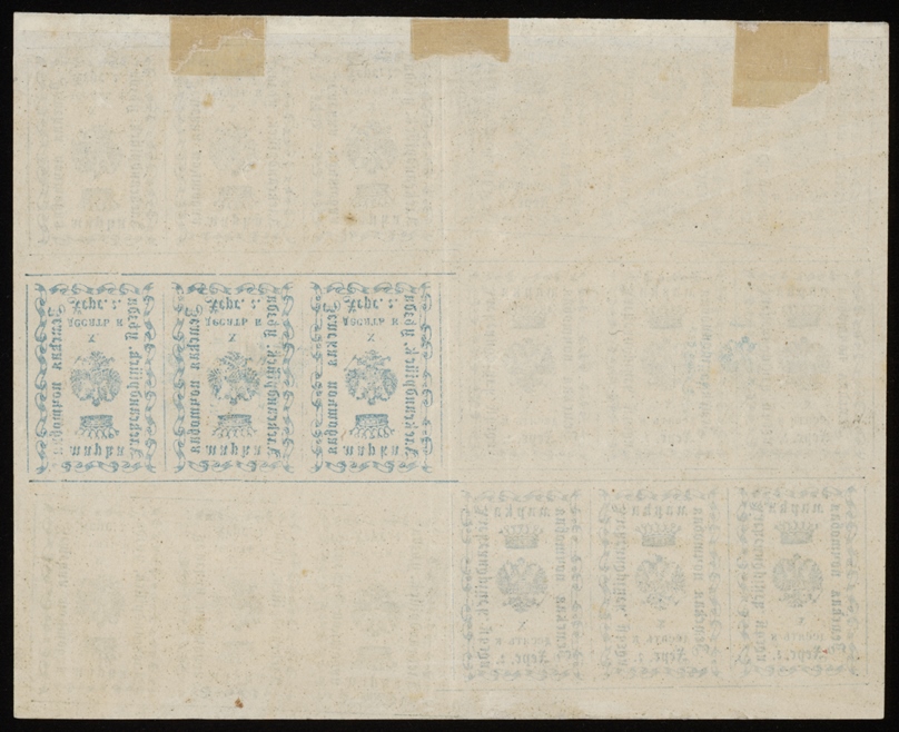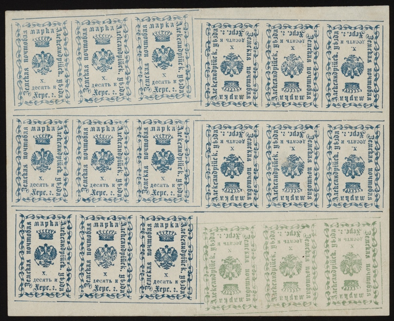 Рис. 7. Лист почтовых марок. 1 шт. (тет-беш горизонтальные: 2 из №4, 1 — из №4 и №5, пара вертикальная 3: №№4 и 5 в правой нижней части листа, абкляч рисунка. №4 — 3 штуки блоком в центре правой части листа). РИ, Херсонская губ., Александрийский уезд. 1880. Герб и корона Российской империи. 10 коп. Шмидт № 4 (15шт.) + Шмидт № 5 (3шт.)