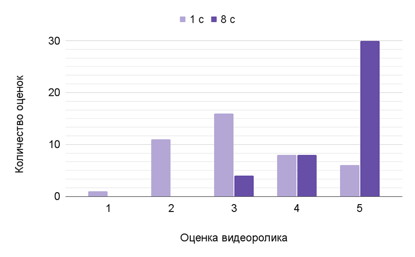 Анализ данных показал, что использование коротких монтажных кадров приводит к снижению удовлетворенности респондентов в сравнении со средней длиной. Если видеоролик с длиной монтажного кадра, равной одной секунде, в основном получал оценки «2» и «3», то видеоролик с длиной монтажного кадра, составившей восемь секунд, в принципе не получал ниже трех баллов по шкале от одного до пяти. На рисунке 5 представлены результаты сравнения оценок роликов с длиной монтажного кадра, равной одной секунде и восьми секундам.