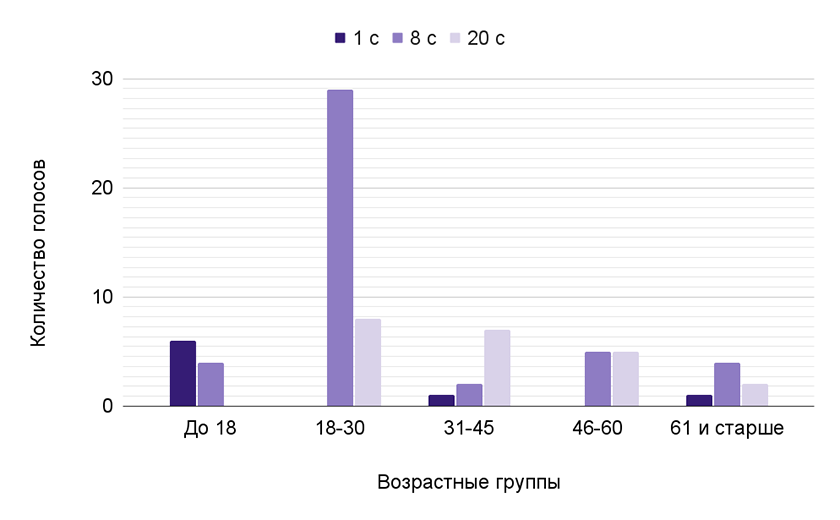 Результаты эксперимента показали, что предпочтения в отношении длины монтажного кадра варьируются в зависимости от возрастной группы: чем старше респонденты, тем они более склонны выбирать видео с длинными монтажными кадрами. На рисунке 6 представлено распределение голосов за тот или иной ролик в зависимости от возрастной группы.