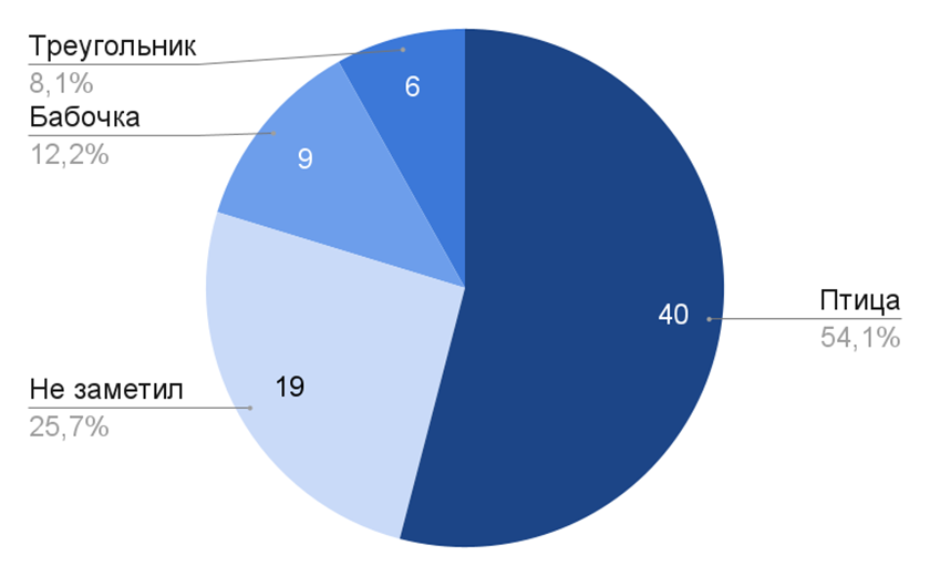 На рисунке 10 представлен график, показывающий распределение ответов на вопрос о форме летучего змея в ролике на тему «Город». Очевидно, что больше половины респондентов, сорок человек, увидели в форме летучего змея птицу, что является правильным ответом на вопрос, какой формы был летучий змей. Это говорит о том, что больше половины респондентов могли разглядеть форму летучего змея, несмотря на то, что время, которое этот змей был на экране, было равно всего лишь одной секунде. Сравнительно меньшая доля респондентов выбрала формы «Бабочка» и «Треугольник»: девять и шесть человек соответственно. В данной ситуации нельзя исключать того факта, что на восприятие данного фрагмента могли повлиять дальнозоркость и короткая длина МК. Потому что девятнадцать респондентов в принципе не смогли распознать форму. Фрагмент располагался в конце видеоэтюда, что также могло повлиять на результаты.