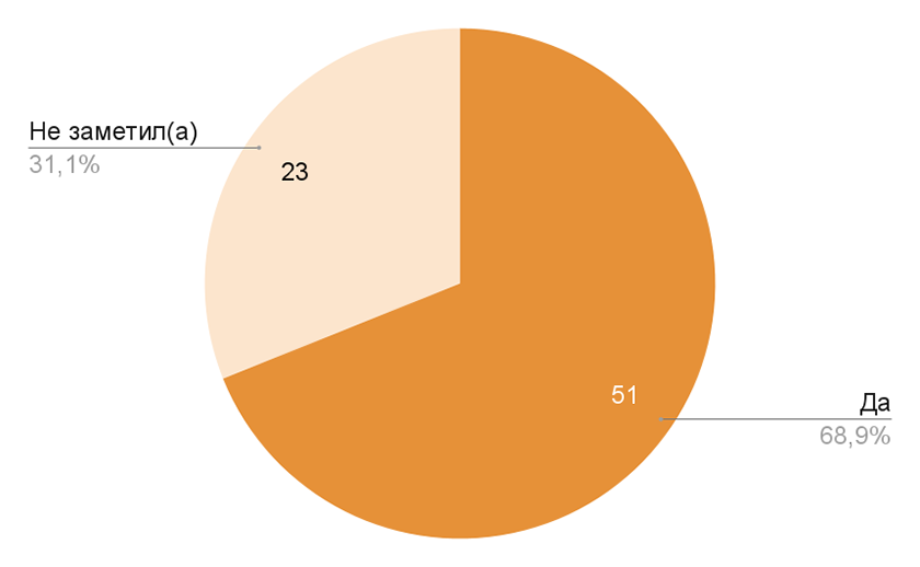 График на рисунке 13 демонстрирует, заметили ли респонденты девушку с розовой сумкой в видеоэтюде. Фрагмент располагался в середине видео. Большинство респондентов, пятьдесят один человек, ответило положительно. Двадцать три человека же утверждают, что не обратили на нее внимание, несмотря на то, что в анализируемом фрагменте девушка появляется достаточно неожиданно, что, казалось бы, не позволяет не заметить ее. Фрагмент находился в середине ролика. Важно отметить, что у респондентов была возможность ответить «нет» на вопрос про девушку с розовой сумкой, но никто ею не воспользовался.