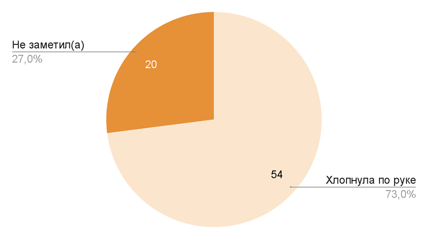Помимо прочего респондентам было предложено выбрать из предложенных вариантов, что в одном из фрагментов сделала девушка у церкви. Результаты представлены на рисунке 14. Из всех предложенных вариантов большинство респондентов выбрали вариант «хлопнула по руке», что является верным ответом на данный вопрос. Другими предложенными вариантами никто не воспользовался. Однако двадцать человек не смогли заметить, что же сделала девушка. Стоит отметить, что данный фрагмент располагался в конце видеоэтюда, что могло повлиять на концентрацию внимания респондентов, ответивших неправильно на поставленный вопрос. Несмотря на то, что у респондентов была возможность ответить «нет» на поставленный вопрос, никто ею не воспользовался.