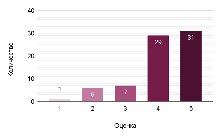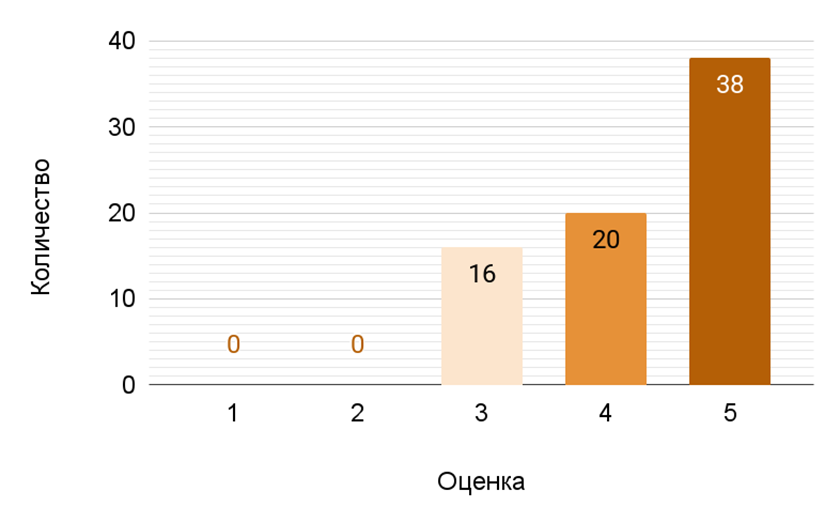 Оценка «5» получила наибольшее количество голосов — тридцать восемь, что указывает на большую степень удовлетворенности среди респондентов. Оценка «4» также набрала значительное количество голосов, составив двадцать. Это говорит о том, что у многих респондентов ролик оставил положительное впечатление. В то же время оценка «3» получила лишь шестнадцать голосов. Оценки «1» и «2» зафиксированы не были. Такой результат позволяет предположить, что в целом видеоролик на тему «Деревня» и его длина МК, равная восьми секундам, произвел больше положительное впечатление на респондентов.