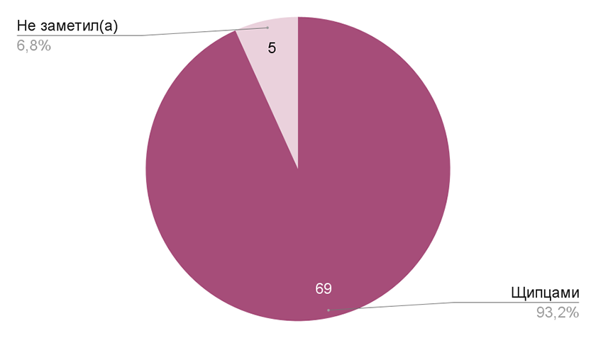 На рисунке 16 представлены ответы на вопрос о том, чем конкретно мастер взяла кусочек металла. Шестьдесят девять человек смогли заметить, что это были щипцы. Но по какой-то причине пять респондентов не обратили на это внимание. Возможно, это можно связать с тем, что данный фрагмент находился в начале видеоролика.