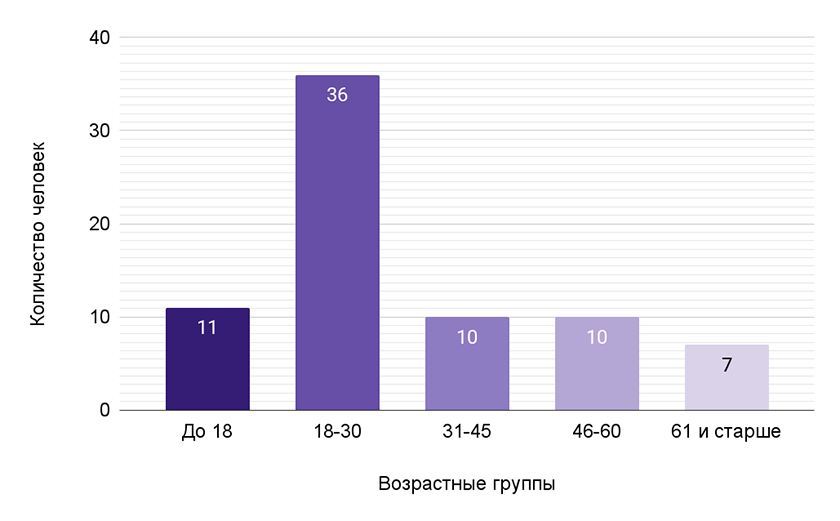 Всего в эксперименте поучаствовало семьдесят четыре человека: пятьдесят шесть женщин и восемнадцать мужчин. Распределение по возрастным группам представлено на рисунке 4.