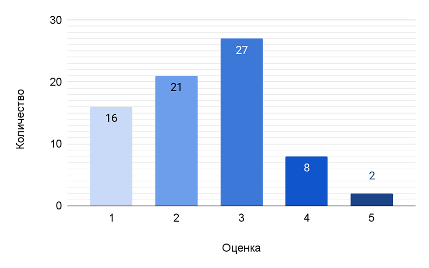 На рисунке 7 представлен график распределения оценок степени удовлетворенности при просмотре ролика на тему «Город». Он демонстрирует, что большинство оценок сосредоточено вокруг средней и низкой оценки. Наивысшую популярность имеет оценка «3», получившая двадцать семь голосов, что может свидетельствовать о нейтральной реакции респондентов или о том, что контент не вызвал у них сильных эмоций. Оценка «2» с двадцатью одним голосом также указывает на наличие значительной доли респондентов, недовольных роликом. Оценка «1», получившая шестнадцать голосов, подтверждает негативные отклики. Это позволяет сделать вывод о том, что большинству респондентов было дискомфортно смотреть видеоролик с длиной МК, равной одной секунде.
