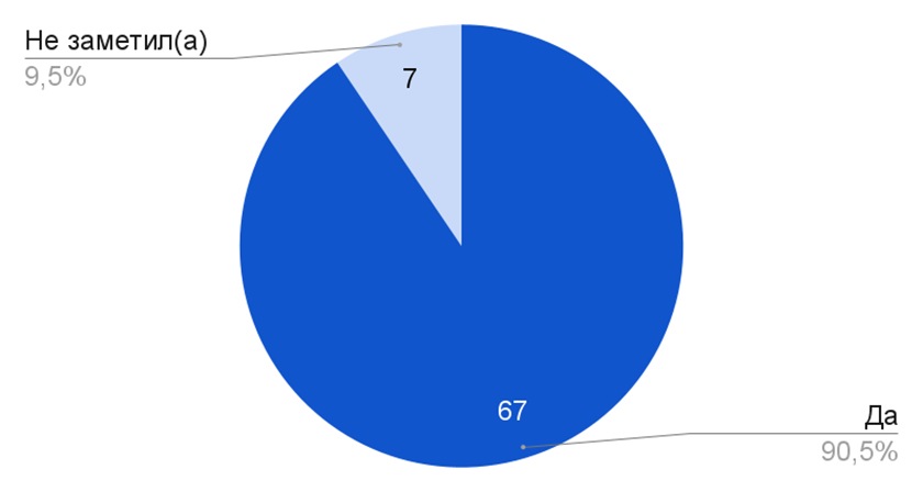 На представленном на рисунке 9 графике распределения ответов на вопрос о присутствии мальчика на велосипеде в ролике на тему «Город» на рисунке заметна четкая тенденция. Согласно данным, шестьдесят семь опрошенных подтвердили, что мальчик на велосипеде действительно присутствует в ролике, что свидетельствует о его значимости для респондентов. Это указывает на то, что этот динамичный кадр был достаточно заметен и запомнился многим. С другой стороны, лишь семь респондентов заявили, что мальчика на велосипеде не заметили. Небольшое количество таких ответов может говорить о различиях в восприятии, возможной невнимательности или же о том, что респонденты сосредоточились на других аспектах ролика. Также роль могло сыграть то, что фрагмент находился в середине видео. Важно отметить, что у респондентов была возможность ответить «нет» на вопрос про мальчика, но никто ею не воспользовался.