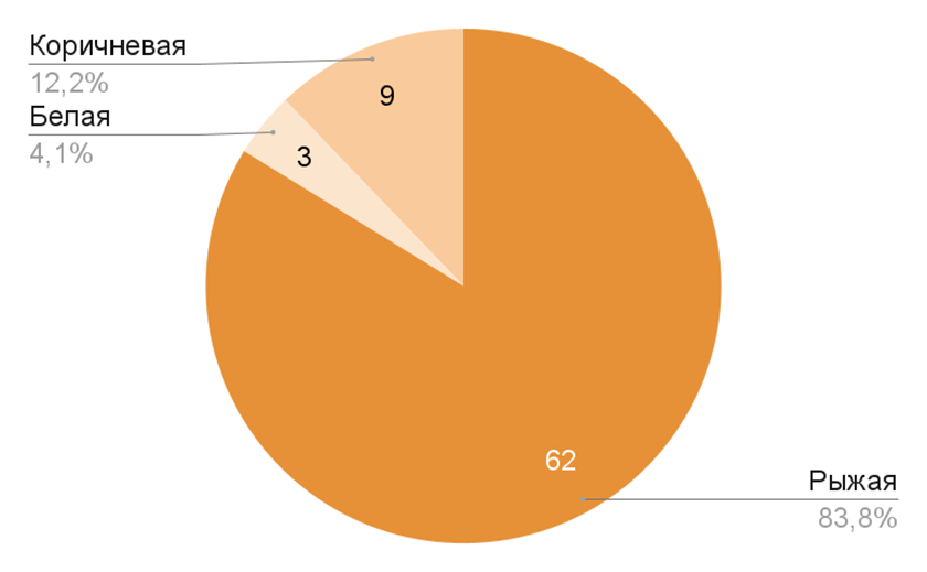 На рисунке 12 представлено распределение ответов на вопрос о цвете лошади в одном из фрагментов видеоролика. Большинство респондентов, шестьдесят два человека, ответили, что лошадь была рыжей. Девять человек указали, что она была коричневой. Эти два результата можно объединить, так как в данном контексте понятия «рыжая» и «коричневая» могут приравнены друг к другу. Итого, получается, что семьдесят один человек, т. е. абсолютное большинство, не только заметил лошадь, но и обратил внимание на ее окрас. Однако три человека ответили, что лошадь была белой, что не соответствует действительности. И все же белый элемент в том фрагменте присутствовал — лошадь тянула белую телегу. Вероятно, именно на нее эти три респондента и обратили внимание. Фрагмент располагался в начале видеоэтюда.